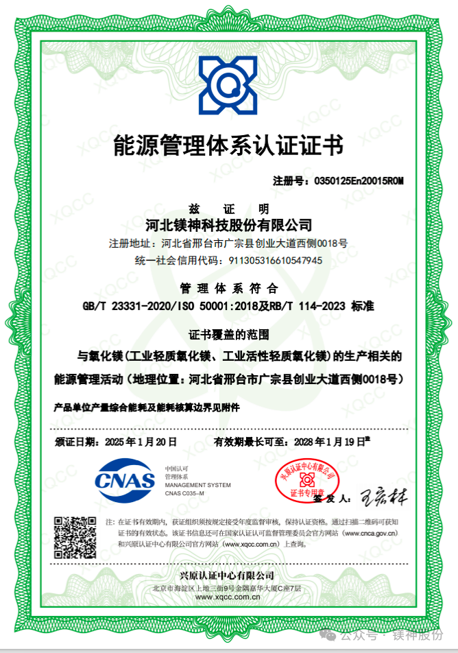 近日,河北鎂神科技股份有限公司獲能源管理體系認證證書,成為行業(yè)內(nèi)首家通過這一重要認證的企業(yè)。這標志著公司在能源管理體系建設(shè)方面達到了新的里程碑,進一步鞏固了其在氧化鎂行業(yè)的領(lǐng)先地位。 ..